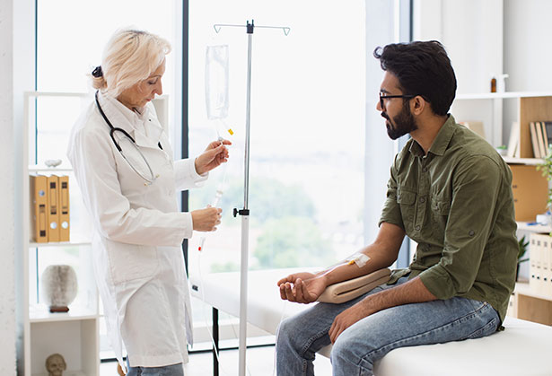 Infusionstherapien kommen zum Einsatz, wenn eine schnelle Wirkung erforderlich ist oder Medikamente nicht oral eingenommen werden können. Auch bei Flüssigkeitsmangel oder zur Verabreichung bestimmter Vitamine und Nährstoffe sind Infusionen die Methode der Wahl. Subkutane (unter die Haut) und intramuskuläre (in den Muskel) Injektionen nutzen wir beispielsweise zur Gabe von Eisen bei Eisenmangelanämie oder zur Substitution von Vitamin B12 oder Folsäure bei nachgewiesenem Mangel.